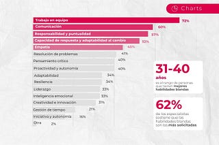 El gráfico muestra que las habilidades blandas más demandadas en los candidatos en Ecuador, están lideradas por el trabajo en equipo (72%), seguido de…