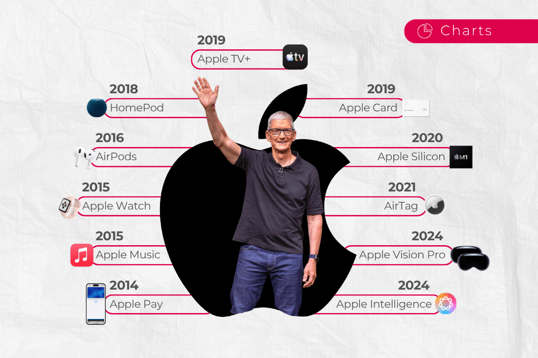 Desde 2014, la compañía ha lanzado productos y servicios clave como Apple Pay (2014), Apple Music y Apple Watch (2015), AirPods (2016) y HomePod (2018), marcando su entrada en pagos digitales, streaming y dispositivos wearables. En 2019, Apple reforzó su oferta con Apple TV+ y Apple Card, ampliando su presencia en entretenimiento y servicios financieros.