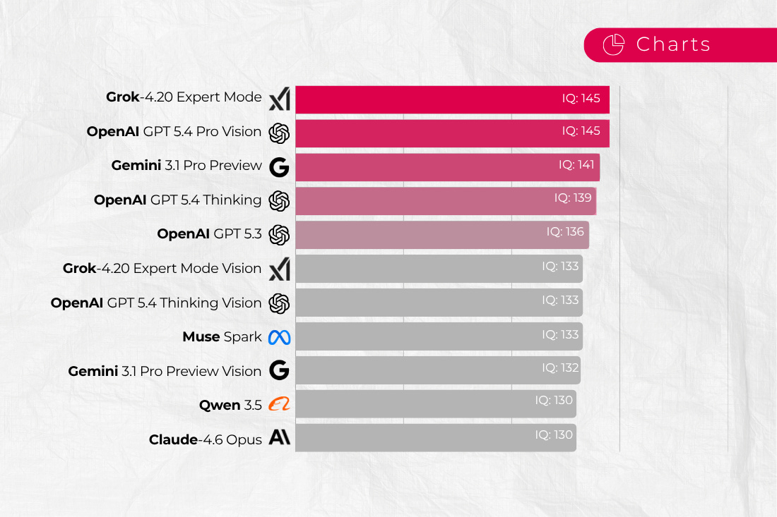 En 2026, Grok 4.20 Expert Mode lidera con 145 puntos IQ, seguido por OpenAI GPT 5.4 Pro Vision y Gemini 3.1 Pro Preview.